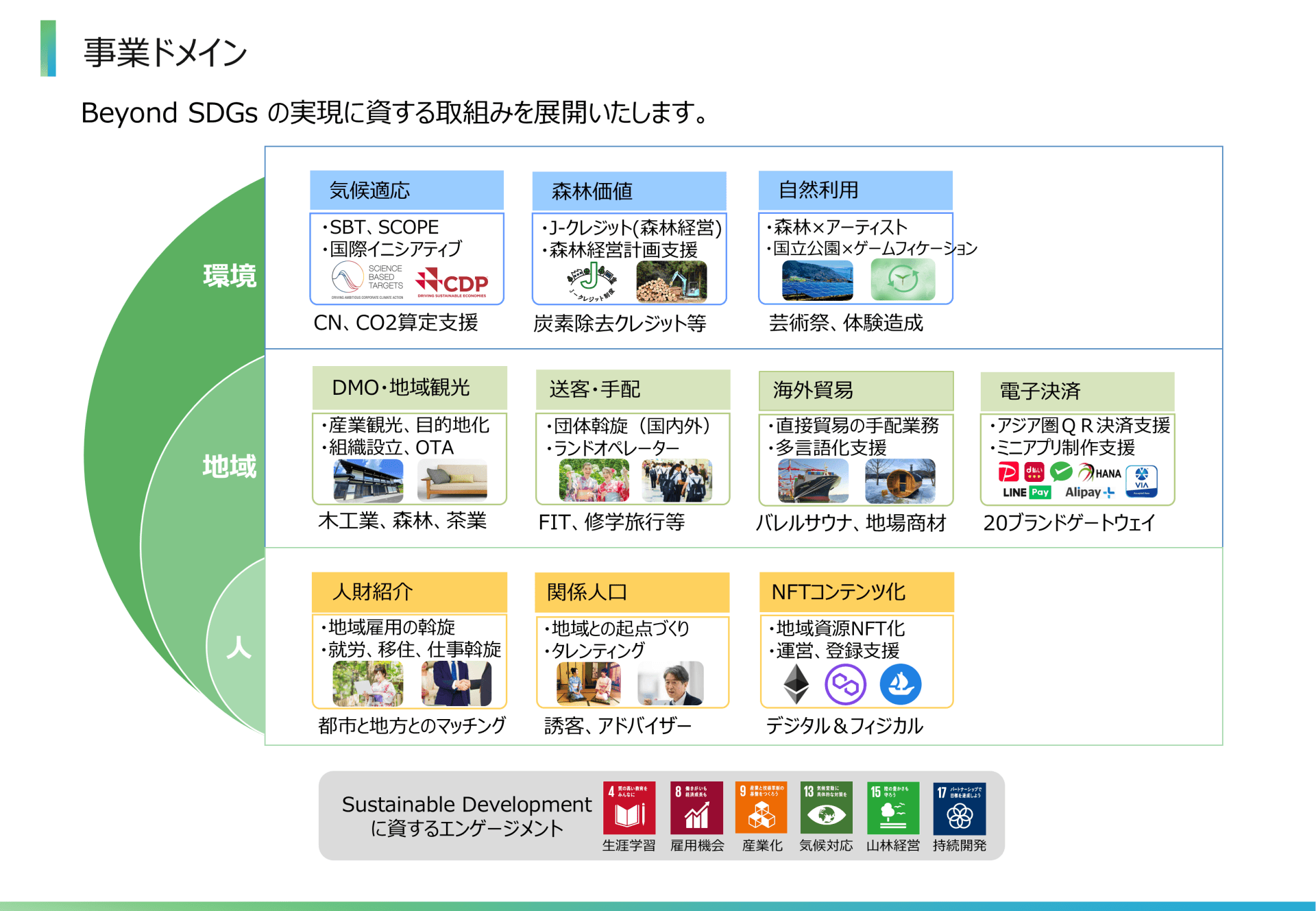 株式会社多美人生開発は、持続可能な発展社会に向けて、ルーラル・ポジティブを提案します。人々や地球がより良い未来を築くために必要なリソースとツールを導き出し、持続可能な社会の構築に向けて積極的な変化を最大化するイノベーションを生み出していきます。