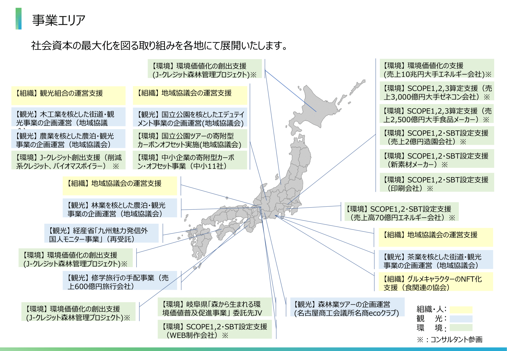 地場産業を軸にしたツーリズムの開発、DMO的組織の計画策定、SNS/OTAプロモーションの代行、有識者のタレンティング、官公庁事業など、社会課題に対して計画やパートナーシップによる実行を行い、地域の持続的な成長をともに伴走支援致します。